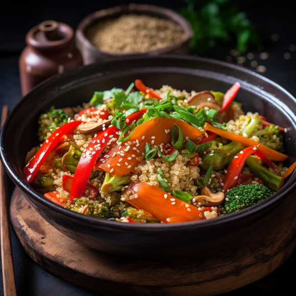 In the skillet, combine the broccoli, red bell pepper, carrot, and snap peas. Vegetables should be stir-fried until they are tender-crisp.