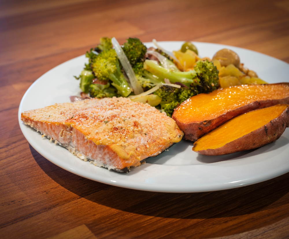 Once everything is cooked, divide the baked salmon, roasted sweet potatoes, and steamed broccoli evenly among four plates.