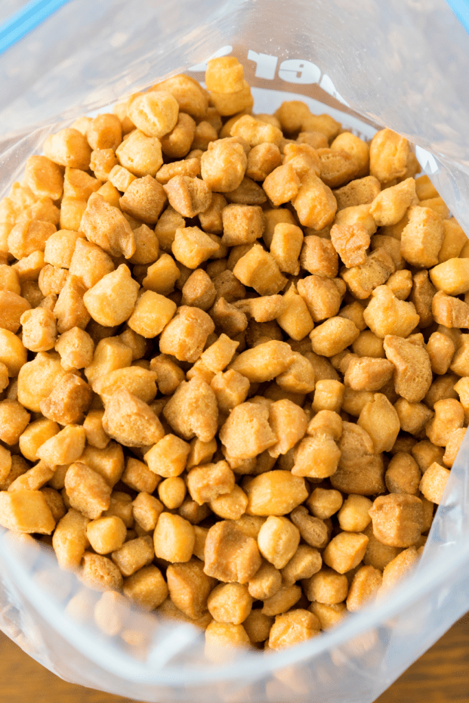 Fry the cut dough in small batches, stirring occasionally to ensure even browning. Fry for three to five minutes per batch, until golden brown.