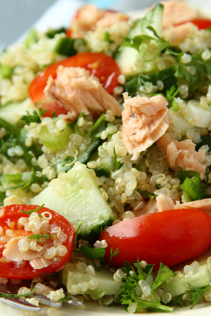 Layer the quinoa on the bottom of the bowl, then top with the salmon, avocado, tomatoes, and leafy greens.
